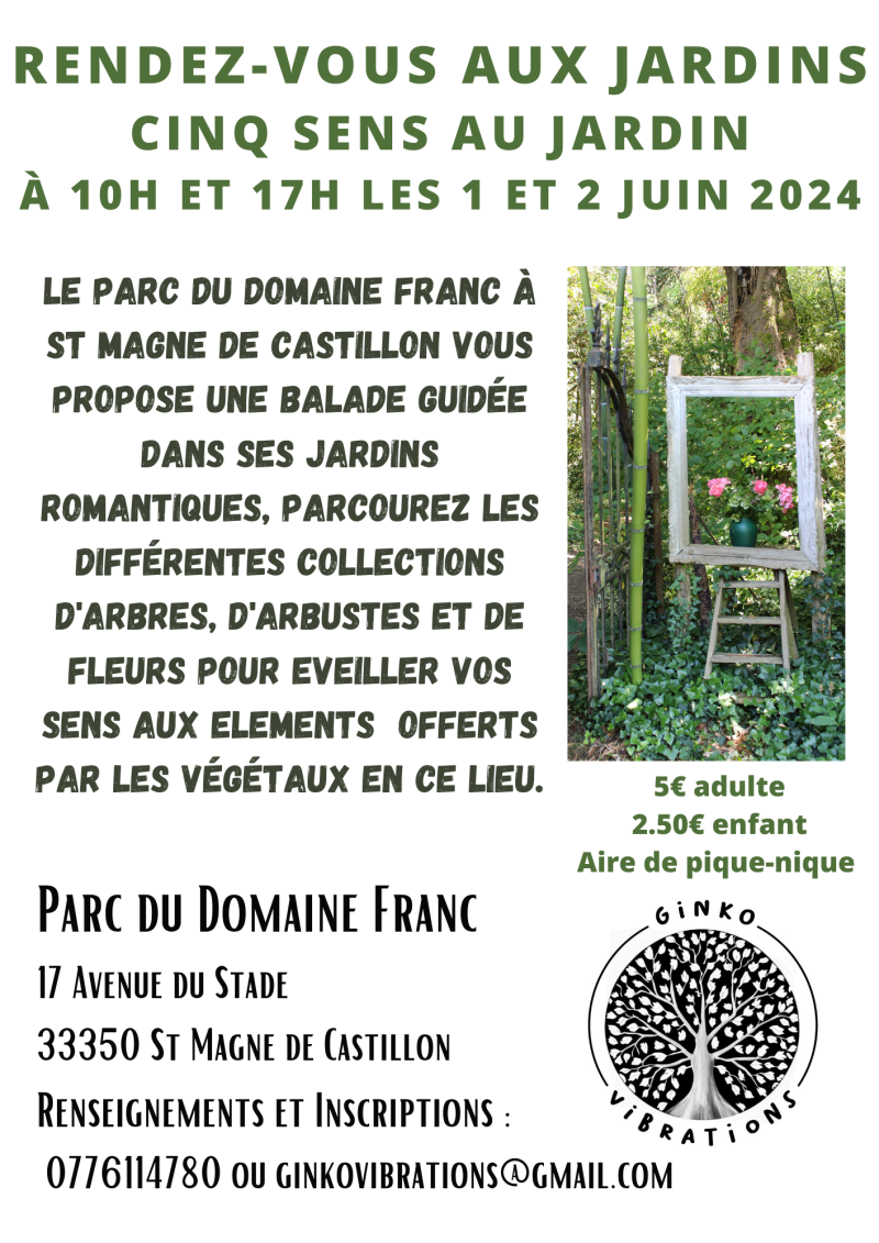 Le parc du Domaine Franc à St Magne de Castillon vous propose une ballade guidée dans ses jardins romantiques, parcourez les différentes collections d'arbres, d'arbustes et de fleurs pour profiter des vibrations offertes par les végétaux en ce lieu.